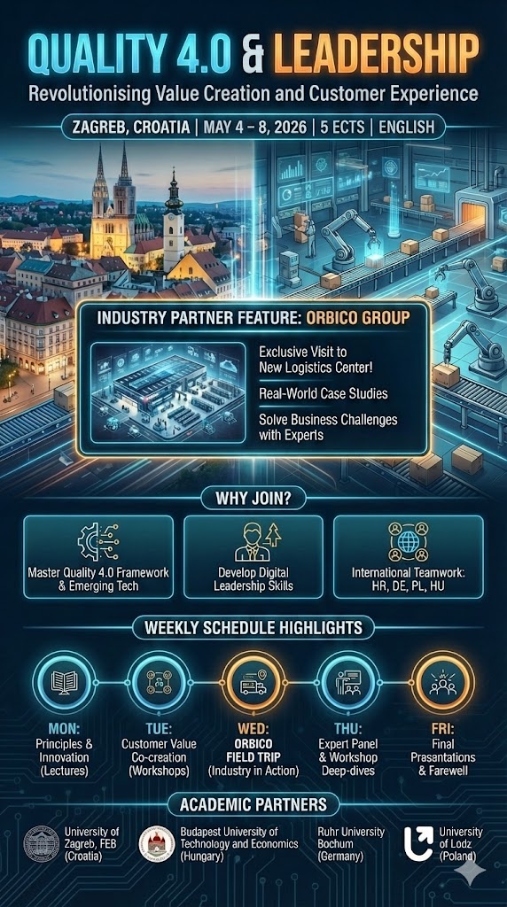 In diesem Jahr gibt es die einmalige Gelegenheit, an einem internationalen Blockkurs zum “Quality 4.0 & Leadership” teilzunehmen. Der Blockkurs (inkl. der abschließenden Prüfungsleistung) findet vom 4. bis 8. Mai 2026 in Zagreb, Kroatien statt.